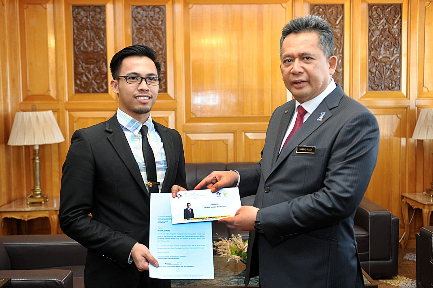 | Sharif menerima sumbangan dari Menteri Besar di atas kejayaannya mewakili Malaysia dalam Asean-EU Young Leader Forum. Foto oleh Zulkifli CW Putra. |