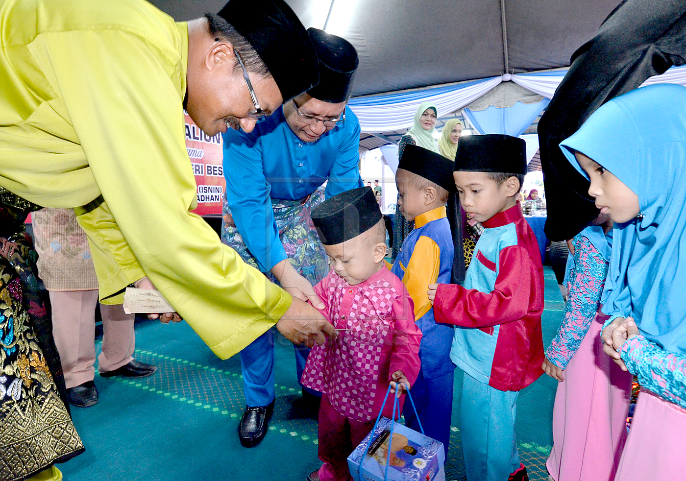 | Ahmad Razif menyampaikan duit raya kepada anak yatim. Foto Zulkifli C W Putra |