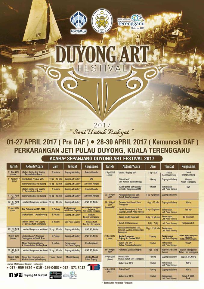 Kerajaan negeri melalui Jabatan Pelancongan Negeri Terengganu dengan kerjasama Duyong Art Gallery dan Terengganu Backpackers akan menganjurkan Duyong Art Festival (DAF 2017) kali ke -3 di perkarangan Jeti Pulau Duyong, Kuala Terengganu.
