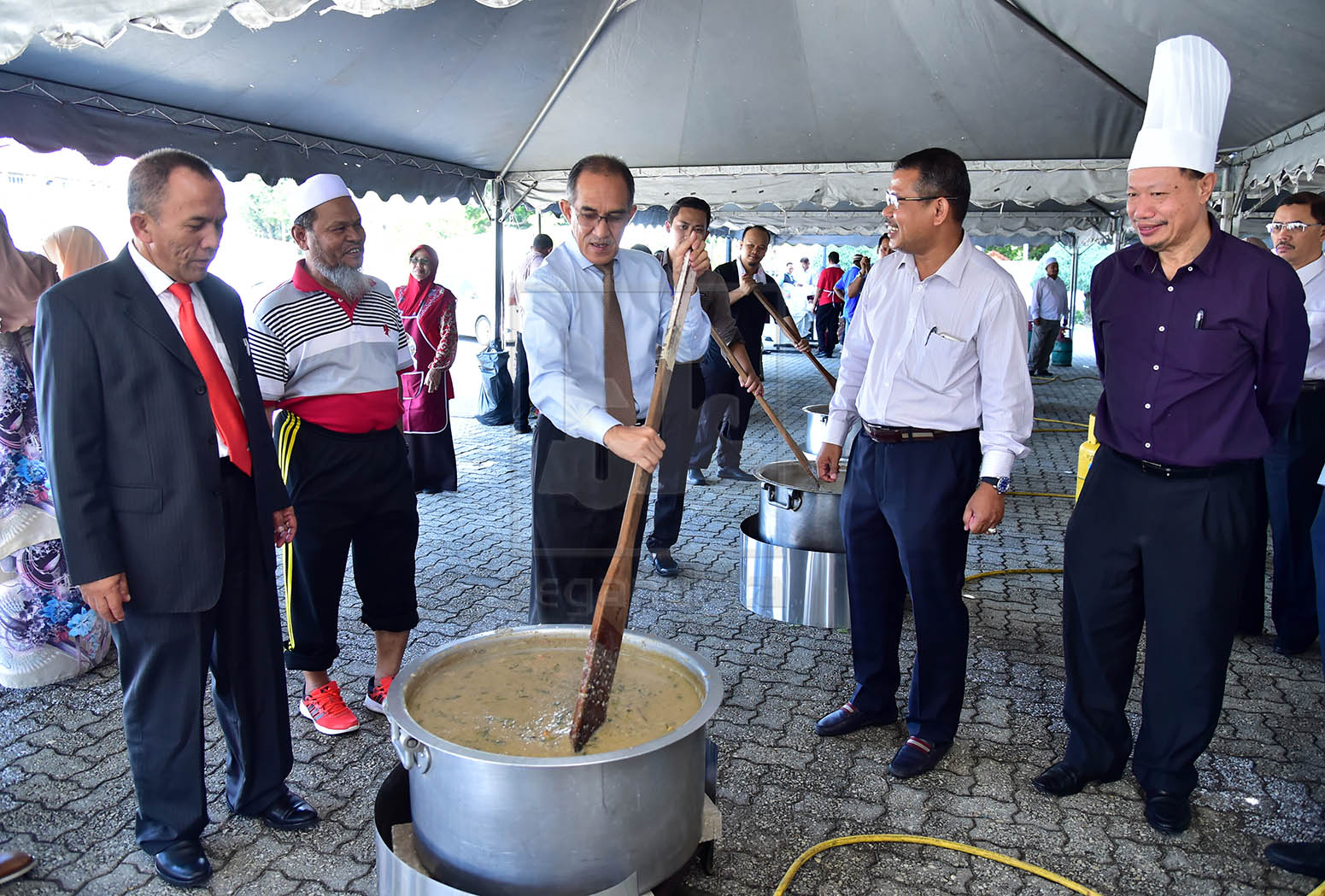 Proses memasak 15 periuk bubur lambuk secara bergotong-royong sesama ahli kelab yang turut disertai Pengerusi Kelab WDI yang juga Setiausaha Kerajaan Negeri, Dato’ Wan Nawawi Wan Ismail.