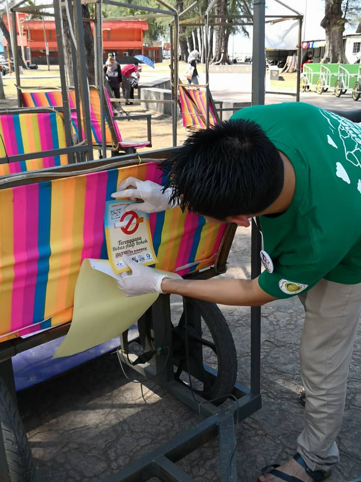 | Peserta menampal pelekat anti merokok di tempat awam. |