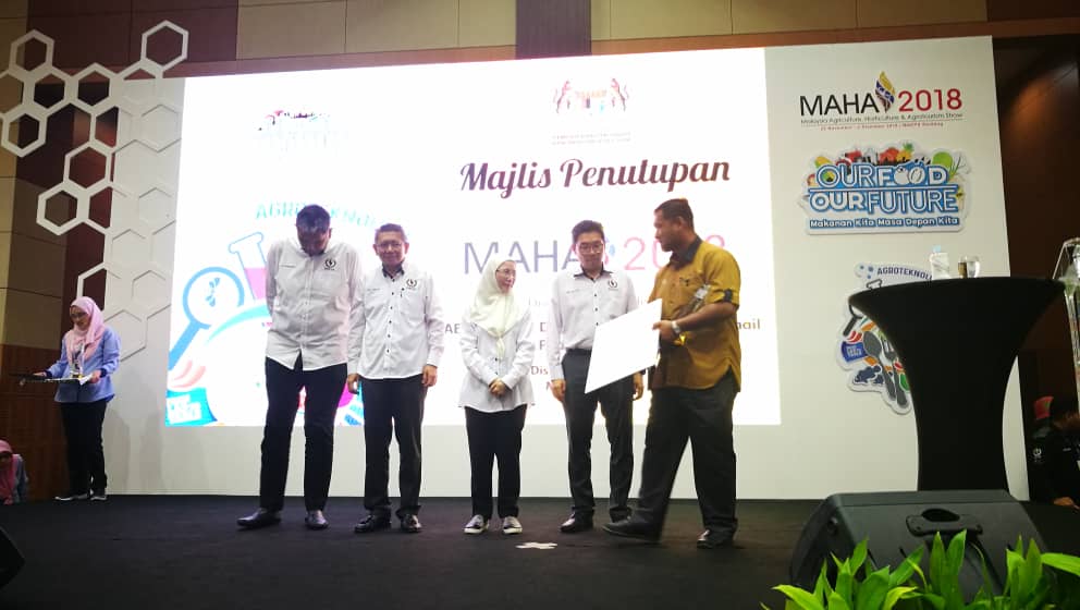 Hadiah kemenangan diterima oleh Timbalan Pengerusi Jawatankuasa Pertanian, Industri Asas Tani dan Pembangunan Desa Negeri,YB Hilmi Harun pada majlis penutupan MAHA 2018 pagi tadi.