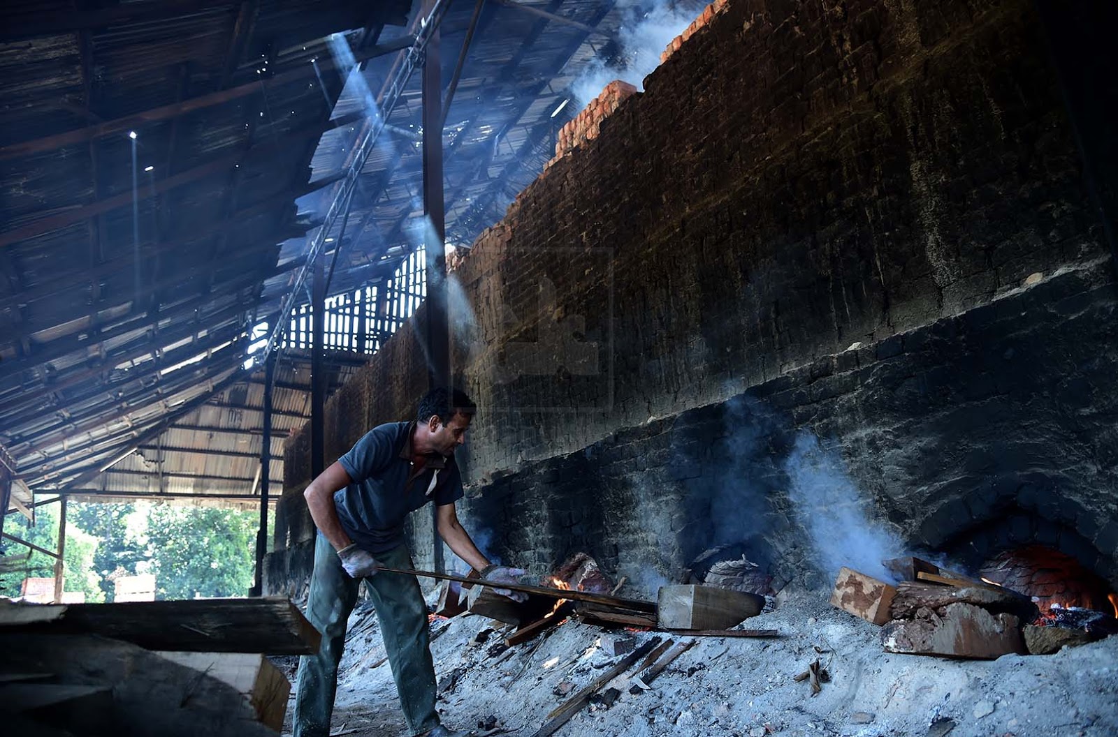 | Seorang pekerja sedang menyusun kayu api untuk proses pembakaran batu bata di dalam relau. Foto oleh Tengku Syamim Tengku Ismail |