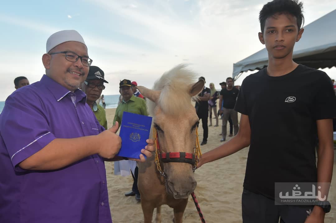 | Ustaz Wan Sukairi menyerahkan pasport kepada salah seorang pemilik kuda sempena Program Immunisasi, Mikrocip dan Pendaftaran 'PET Passport' (PIPM) kepada kuda terpilih di Pantai Batu Buruk |