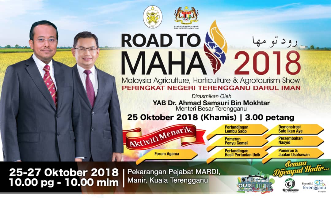 KUALA TERENGGANU, 19 Oktober - Kerajaan Negeri Terengganu menyeru seluruh rakyat Terengganu dan negeri-negeri berjiran untuk berkunjung ke program Road To MAHA bertempat di Institut Penyelidikan dan Kemajuan Pertanian Malaysia (Mardi) Manir, Kuala Terengganu pada 25 hingga 27 Oktober ini.