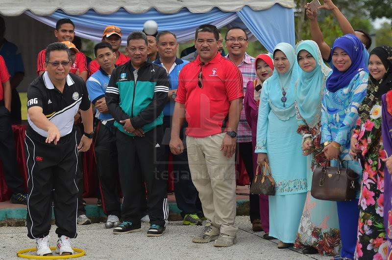| Ahmad Razif melontar bola petaque sebagai simbolik merasmikan majlis penutup Kejohanan Petanque Terbuka Batalion 9, PGA Gong Badak, semalam. Foto oleh Harish Fadzillah |